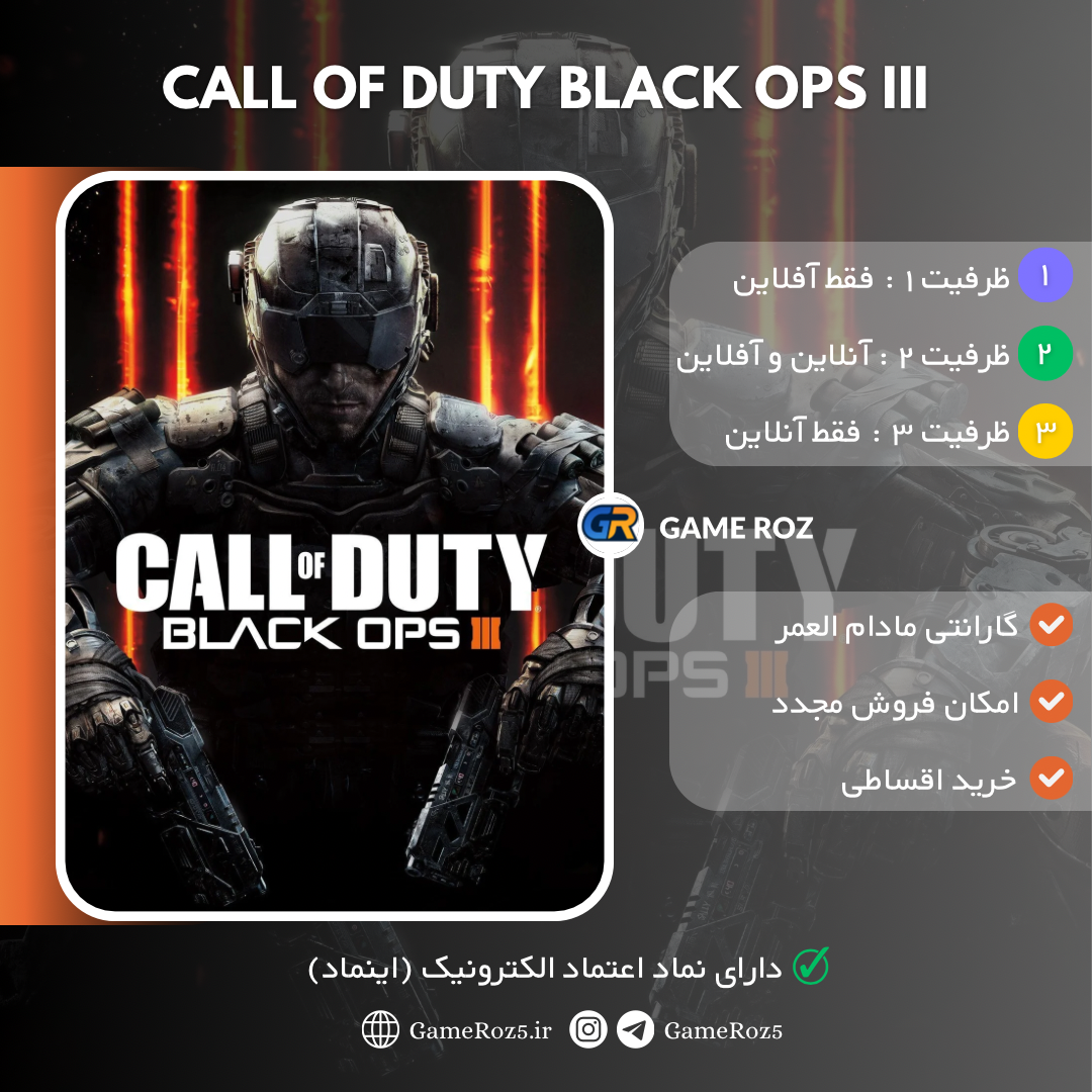 Call of Duty: Black Ops III یا بهاختصار BO3، یک بازی تیراندازی اولشخص (First-Person Shooter) محصول شرکت Activision و توسعهیافته توسط استودیوی Treyarch است. این عنوان در تاریخ 6 نوامبر 2015 برای کنسولهای PlayStation 4، Xbox One و PlayStation 3 منتشر شد. Black Ops III سومین قسمت از سری محبوب Black Ops و سیزدهمین نسخه از فرنچایز Call of Duty محسوب میشود.